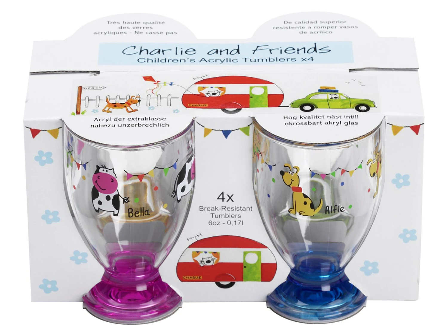De Flamefield Charlie and Friends glazen zijn bedrukt met een vrolijke print en geschikt voor kleine kinderen. Deze glazen zijn gemaakt van hoogwaardig acryl, dat vrijwel onbreekbaar is. Ideaal voor allerlei outdoor evenementen zoals BBQ’s, picknicks, op de camping of bij kinderfeestjes.