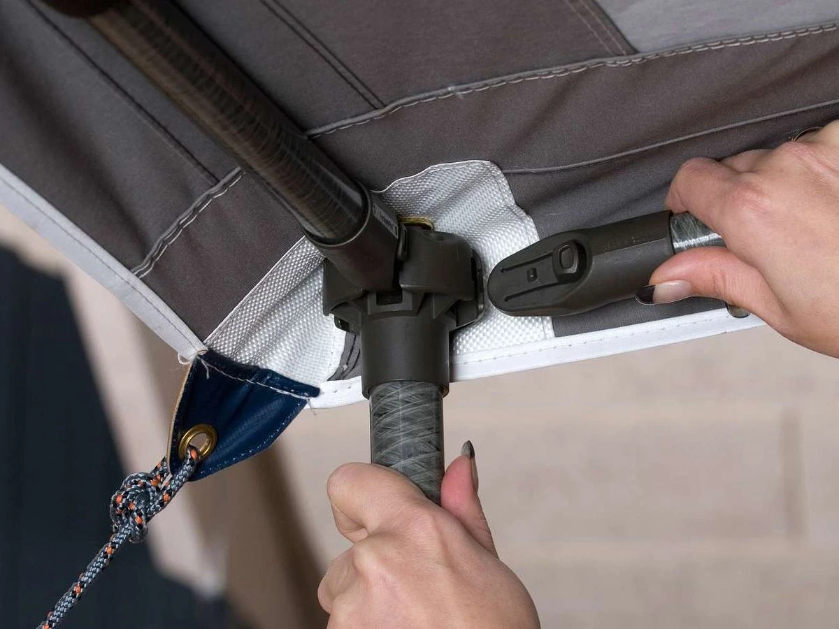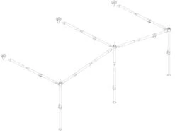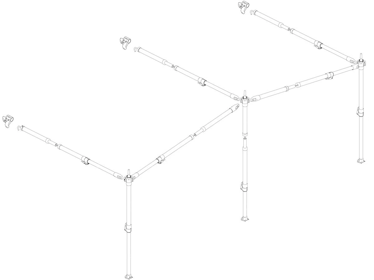 Het frame is voorzien van 3 staanders en 3 dakliggers. Met de meegeleverde F-links kun je het luifelframe aan het voortentframe van je Isabella of Ventura voortent koppelen.