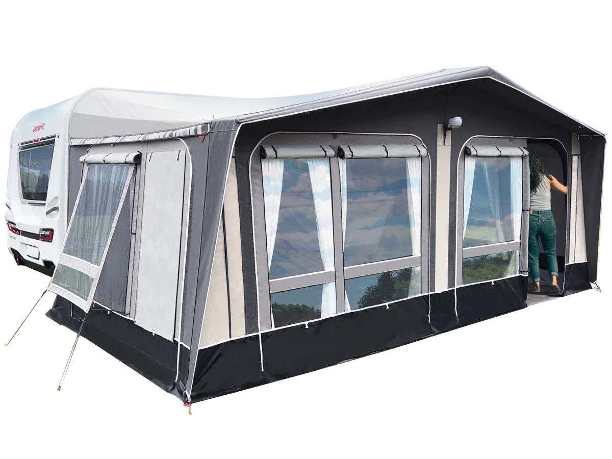 De Isabella Nordic 300 is een robuuste seizoensvoortent voorzien van afdekflappen voor alle ramen.