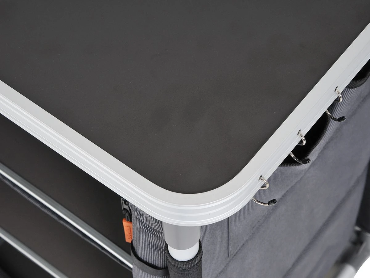 De kast is voorzien van vier verstelbare poten zodat je de kast altijd waterpas kunt zetten op een ongelijke ondergrond. Het blad is van MDF en afgewerkt met een aluminium rand, hierdoor is de kast NIET water- en hittebestendig.