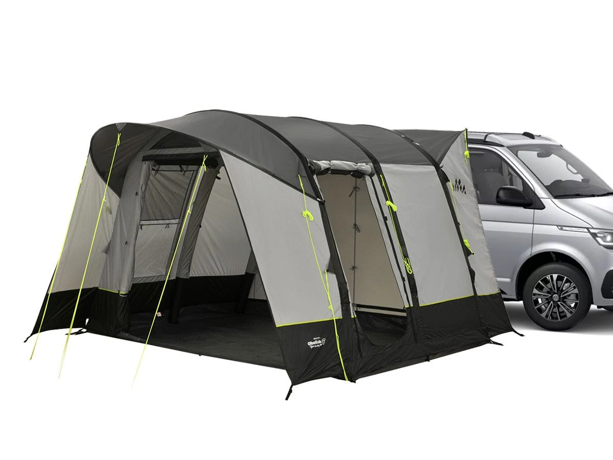 De achterwand van deze bustent is in twee delen op te rollen naar het midden, wanneer je beide delen oprolt heb je bijna de gehele achterwand als doorgang naar het voertuig. Wanneer je met het voertuig op pad wenst te gaan dan kun je de sluis ook oprollen zodat deze er niet los bij blijft hangen en gaat klapperen in de wind.