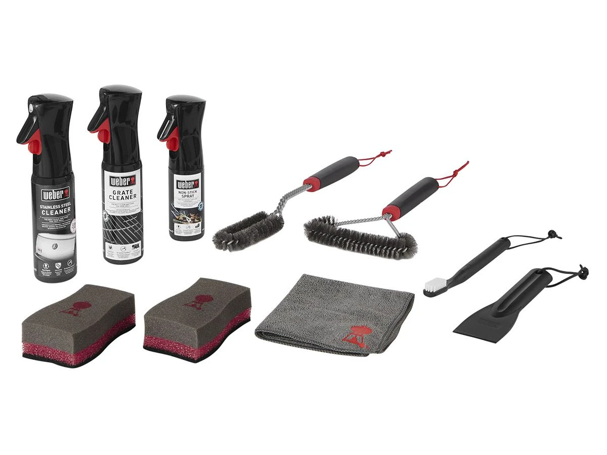 Met deze set krijg je een reinigingsborstel, reiniger, spons, schraper, borstel voor bescherming tegen spinnen, anti-aanbakspray, reiniger voor RVS en een microvezeldoek. Met dit assortiment houd jij je barbecue zeker schoon.